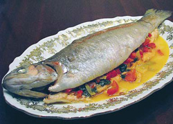 речная форель или любая другая рыба весом около 600 г, большой сладкий перец, луковица, пучок петрушки, половина лимона, при желании 1–2 столовые ложки панировочных сухарей или муки, небольшой кусочек сливочного масла, соль, перец, сахар. Рыбу почистите, срежьте плавники, выпотрошите. Удалите кости. Для этого сначала перережьте кулинарными ножницами ребра в местах их крепления к позвоночнику. Далее продлите надрез, сделанный на брюшке при потрошении рыбы, вплоть до хвостового плавника и, двигаясь все время вдоль костей, отделите позвоночник от мякоти. Позвоночник отсеките и уберите. Выньте Удалите реберные кости. Пинцетом достаньте и удалите мелкие кости. Рыбу посолите, поперчите, сбрызните лимонным соком и оставьте мариноваться на 10–15 минут.