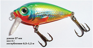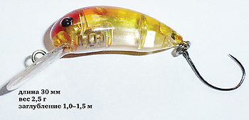 В головной части приманки неподвижно закреплен небольшой свинцовый грузик-балансир, никаких погремушек здесь нет. Оснащается воблер одним безбородочным одинарным крючком из тонкой проволоки, номер его я определить затрудняюсь из-за сложной формы поддева (ориентировочно №№ 4–6).