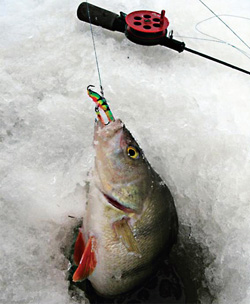 Собственно, по полосатому этот балансир и выступил фаворитом нескольких рыбалок прошлого сезона, причем отличился он в морозное февральское глухозимье. Кроме окуней балансир отлично соблазняет некрупного судака. Конечно же, никаких вопросов и по поклевкам зачетных клыкастых не будет, окажись этот балансир в их поле зрения, но при возможности поимки трофея наша команда все же старается увеличить размер приманки.