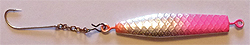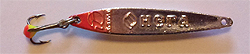 По форме блесна более или менее стандартная и вместе с тем легкоузнаваемая, во всяком случае название своей блесны, на которую ловлю не первый сезон, в каталогах нашел без труда. Тело у приманки ромбовидное, довольно широкое в головной части и сужающееся к хвостику. Поперечный изгиб блесны очень небольшой, практически незаметный. На спинке хорошо видны рельефные «чешуйки», на брюшке выбито слово «Kuusamo». Примечательно, что к леске приманка крепится не с помощью отверстия в теле, как большинство отвесных блесен, а за проволочное ушко, как обычный крючок. Это довольно удобно, особенно если пользоваться небольшими застежками. Вообще же, на мой взгляд, блесну лучше крепить к леске с помощью петли – в этом случае игра получается наиболее активной.