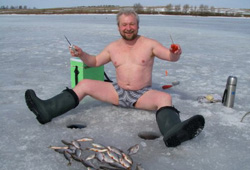 Выпили чаю, пробурили еще несколько лунок ближе к берегу. На этот раз повезло, за полчаса натаскали два десятка окуньков, около часа ставили жерлицы, затем снова сели к лункам ловить рыбу на удочки. Минут за сорок рядом с ящиком уже была приличная горка окуней, прямо как стандарт, от 250 до 300 грамм каждый. Тем временем Славка вытащил двух щурят грамм по 700 на балансир. Тут начали срабатывать наши жерлицы: одна, вторая, третья затрепыхали на ветру красными флажками. Смотав удочки, пошли доставать добычу. В это время и Серега к озеру пришел.