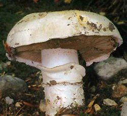 Плодовое тело. Шляпка диаметром от 6 до 12 см, от белой до коричневатой, мясистая, раскрывается уже внутри почвы, а потому обычно покрыта землей, листиками и т.п. Этот гриб способен поднять асфальт и даже камни мостовой! Край шляпки завернутый. Пластинки в молодости розовые, позже шоколадно-коричневые, свободные. Споровый порошок коричневый. Ножка сильная, беловатая, цилиндрическая, в соотношении с диаметром шляпки короткая, с двойным, глубоко сидящим кольцом. Мякоть жесткая, грязновато-белая, слабо краснеющая, с кисловатым запахом.