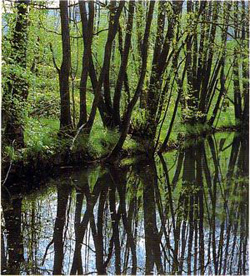 По берегам рек и ручьев смешанные леса часто образуют особые сообщества. Осина, ольха, дубы, тополя, вязы и ивы составляют лесные полосы иногда лишь в несколько сотен метров шириной. Не менее, чем деревья, разнообразен и травяной покров в этих прилегающих к воде лесах, причем особенно богато представлены здесь весенние цветы. Фиалки, анемоны, хохлатка, медуница, первоцвет, аронник весной превращают лесную землю в цветочный ковер. Увы, первозданные леса стали в наше время редкостью. Их место заняли посадки тополей, где растянулись необозримые и непроходимые заросли крапивы и расцветает пышным цветом бузина.