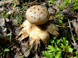 Далее наткнулись на поляну старых головачей, которым начисто снесло "головы". Непонятно, это перезимовавшие или грибы уже этого года? Хотя вообще-то рано. Когда бы они успели?