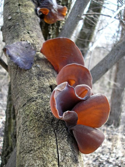 И ещё валежные стволы местами сплошь поросли Аурикулярией плёнчатой Auricularia mesenterica. Грибы эти развиваются, активно растут именно в холодную пору.