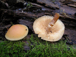 Да, сезон закончен. Это ясно. Но напоследок, чтоб скрасить грустные нотки, представлю галеринообразные грибочки, которые попадаются мне постоянно поздней осенью, и только тогда. Видел я их и сегодня. Издали они напоминают фламмулину. Но они мельче, субтильней фламмулин, шляпки 1-3см, пластинки приросшие, слабонисходящие. Грибочки водянистые, без ощутимого запаха. Я подозреваю, что это Galerina marginata. Вроде размеры подходят, цвет, субстрат (валежная древесина, поросшая мохом), и колечко виднеется... Но неясности остаются. Например, пишут, что у маргинаты полая ножка, а у моих галерин полости я не заметил.