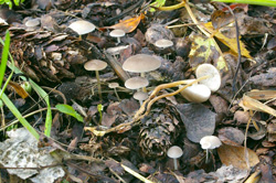 А так, в общем, грибы поют о разлуке. Нет, пни еще курчавятся разнообразными миценами и кирпично-красными лжеопятами, на опушке попадаются любопытные энтоломы, «подвишни», белые и желто-бурые рядовки, травянистые кочки пестрят, на радость юным естествоиспытателям (которых тут, впрочем, нет), полуланцетовидной псилоцибой, кое-где попадаются сине-зеленые и белые строфарии, а на перилах моста через канаву выросла борода какой-то дрожалки, но… В общем, даже новый для меня гриб-шишкоед – видимо, баеоспора мышехвостая (Baeospora myosura), - не порадовал так, как мог бы.