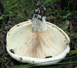 А в роще всё те же комары, но грибы другие. Мне повезло: я попал на первый очень короткий слой шампиньонов. Они гуськом карабкались на пригорок и сбегали с другой стороны. Судя по всему, это был типичный Agaricus sylvicola, у которого на русском языке много синонимов: перелесковый, гладенький, тонкий… Увы, очень много было червивых. Я обрезал червивые места, и в ведре у меня образовалось этакое бело-коричневое крошево. Всё же на маленькую сковородку хватило, чтоб пожарить. Несколько раз попались молодые шампиньоны, которые меня так насторожили прошлой осенью своим не очень приятным запахом и тем, что они мгновенно желтели даже при слабом прикосновении. Особенно края шляпки и манжетка. Но это не шампиньон желтеющий (А. xanthoderma). Тот белый, а у этого шляпка серых оттенков, с чешуйками. И не лесной. Лесной краснеет, а не желтеет. И что ещё интересно, эти шампиньоны ни разу не предстали предо мной во взрослом виде. Тогда, быть может, мне легче было бы их опознать. Так что вопрос пока открыт.