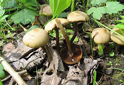 Открыл парад какой-то малознакомый мне грибок. Морщинистая шляпка, расслаивающаяся "черепицевидным" образом, что-то мне мучительно напоминает. Что именно - понять не могу. Может быть, изображение какого-нибудь полевика-agrocybe? Но если и так, то сходство тут чисто поверхностное: споры у этого гриба чернее черного. Пластинки, впрочем, не черные, а скорее ржаво-глинистые, ножка полая, но не ломкая и не белая, и вообще всё очень, очень сложно. Запах приятный, но как будто бы немного щелочной. И всё-таки это, наверное, какая-то псатирелла. Непонятно только, какая.
