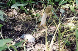 Утро встетило нас забавным натюрмортом: под кустом стояла небольшая веселка, рядом - дохлая мышь. Подобное тянется к подобному. Странно, у этой веселки шляпка светлая и морщинистая, мозговидная, а у прошлой, которую мы нашли на опушке леса, шляпка была коричневая и гладкая. Один это вид или разные? Ничего не понимаю в веселках, ничего.
