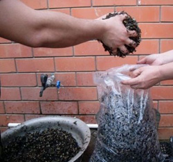 Теперь вернемся к оставленной нами лузге. Образуясь после лущения семечек, она представляет собой довольно неприглядное зрелище и вызывает к себе небольшое расположение. Однако мнение гриба на сей счет представляется совсем иным. Ему лузга придется явно по вкусу. Поэтому надо запастись терпением и собирать лузгу пригоршню за пригоршней после каждой съеденной порции семечек. Хранят ее в плотно закрытых полиэтиленовых мешочках. При хранении необходимо исключить возможность ее отсыревания. Предрасполагающим моментом к этому могут служить остатки слюны — побочного явления от пребывания семечек во рту любителей щелкать их зубами. Конечно, можно не отказывать себе в удовольствии пользоваться таким способом очистки, но тогда каждый раз перед укладкой лузги в мешочки, ее требуется просушивать. Массу раскидывают тонким слоем на цисте свежей газеты, оставляя в таком положении на 10-12 часов. Хорошо просушенная лузга не липнет к рукам и обладает достаточной сыпучестью. Здесь можно порекомендовать еще один прием, благодаря которому приготовление субстрата впоследствии значительно упрощается. Это уплотнение или уплощение частиц лузги. Как было сказано выше, плотная основа лузги позволяет сделать из нее более однородный субстрат, с минимальными пустотами в нем. Легче добиться нужного результата с небольшими порциями лузги, поочередно, затратив немного труда, чем потом, когда будет собрана основная масса и потребуется приложение изрядного количества сил. Для этого лузгу насыпают небольшим слоем на дно металлической емкости (кастрюли, миски) и давят деревянным пестиком.