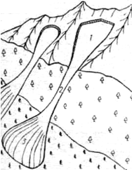 1 — зона зарождения лавин; 2 — зона транзита; 3 — зона отложения снега