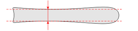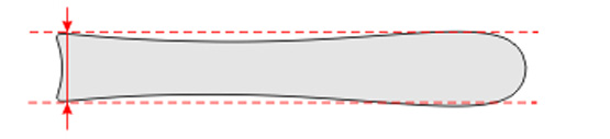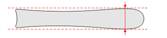 Ширина носа (Nose width, Tip wight) - расстояние между противоположными кантами в самом широком месте доски у носа. Ширина носа непосредственно связана с радиусом бокового выреза и продиктована именно этим параметром. Геометрия бокового выреза задает ширину носа доски.