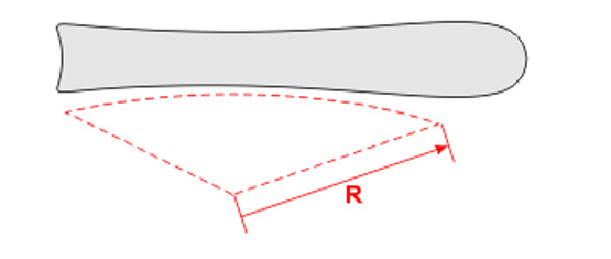 Радиус бокового выреза (Sidecut radius) – для возможности поворачивать, сноуборду необходим вырез в средней части. В зависимости от радиуса этого выреза доска будет поворачивать больше или меньше при равных прочих условиях. Больший радиус бокового выреза делает доску более поворотливой. Малый радиус бокового выреза напротив, делает доску мене поворотливой. Практически во всех сноубордах применяется несколько различных боковых вырезов одновременно. Например в районе носа – радиус 12м, в районе талии 8м и в районе хвоста 10м. Это позволит совершать большие дуги загружая нос или хвост доски, и маленькие загружая доску в районе талии.