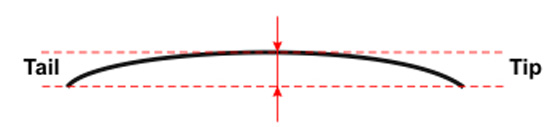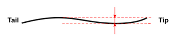 Ширина хвоста (Tail Width) - расстояние между противоположными кантами в самом широком месте доски у хвоста. Так же как и в ситуации с шириной носа доски, ширина хвоста также непосредственно связана с радиусом бокового выреза.