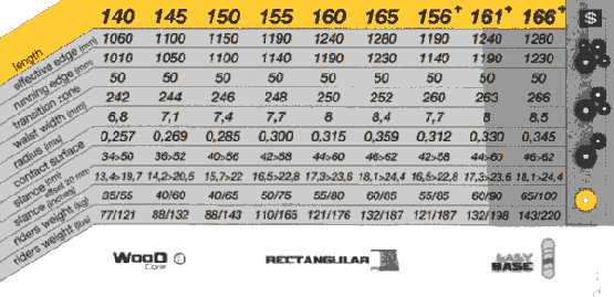 Например компания "Rossignol" прилагает к каждой продаваемой доске этикетку с указанием веса райдера (см. предпоследняя строка) для каждой длинны данной модели в сантиметрах (см. первая строка отмеченная желтым цветом).