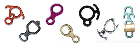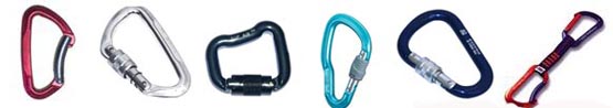 Карабины. В скалолазании используют как немуфтующиеся карабины так и карабины с завинчивающейся или с автоматической муфтой. Из двух карабинов без муфты и короткой стропы собирают оттяжку для лазания с нижней страховкой. Большие V-образные карабины с муфтой используют для крепления страховочного устройства к беседке и, в некоторых случаях, для пристегивания себя к провешенной веревке.