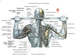 Б) Подтягивания выполняются из виса на прямых руках. В первой фазе движения вы поднимаете тело вверх, не сгибая при этом руки. При этом сильно нагружаются мышцы спины, плечи двигаются вверх и назад. Во второй фазе вы "доподтягиваетесь" уже со сгибанием рук. Таким образом получается, что ваши плечи как бы описывают полукруг. При выполнении таких подтягиваний максимально работают мышцы спины.