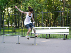 Начинать кататься лучше в местах, где нет машин и людей, например в парках. При этом для первого раза лучше выбирать ровную поверхность, без уклонов и подъемов. Поставьте ногу над передними колесиками, а второй, опорной, ногой оттолкнитесь от поверхности, как только доска тронулась, поставьте ногу на скейтборд. Попробуйте проехать на доске, полностью стоя на ней, сохраняя при этом равновесие. Чтобы скейт не разгонялся, опорную ногу отодвиньте назад и усильте давление на нее.
