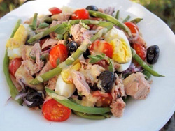 Выложить в миску фасоль, маслины, тунец, помидоры, залить заправкой, посолить и поперчить, перемешать. Разложить по тарелкам, сверху выложить яйцо и петрушку.