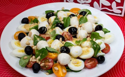 На дно тарелки выложить салатные листья. Порезать пополам сваренные перепелиные яйца, выложить их на салат. Порезать пополам помидоры черри, выложить на яйца. Сверху посыпать кедровыми орешками и тёртым сыром, выложить маслины. Украсить зеленью на свой вкус.