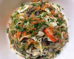 Лук нарезать полукольцами, грибы - пластинками, крабовые палочки - соломкой и всё обжарить. Морковь отварить, натереть на крупной тёрке. Соединить все ингредиенты, перемешать, заправить оливковым маслом по вкусу.
