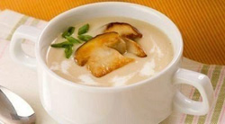 Грибы нарежьте ломтиками и обжарьте на оливковом масле. В конце жаренья посолите, поперчите. Капусту разберите на соцветия и нарежьте. Картофель и репчатый лук нарежьте кубиками. Подготовленные овощи слегка обжарьте на сливочном масле, добавьте немного воды и тушите 10 минут под крышкой. Залейте овощи горячим бульоном и доведите до кипения. Добавьте молоко и снова доведите до кипения, затем посолите и варите суп до готовности. Влейте в суп сливки и взбейте его блендером, затем прогрейте, не доводя до кипения. При подаче в каждую тарелку с супом разложите грибы. Посыпьте суп зеленым луком.