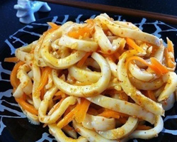 - перемешиваю: кальмар, морковь, соль, сахар и уксус
