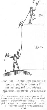 Практическим упражнениям должна предшествовать беседа, в ходе которой даются сведения о принципах динамической страховки, особенностях взаимодействия партнеров по связке и между связками на маршруте восхождения. Даются понятия о «факторе рывка», надежности скальных крючьев и страховочной веревки и т. п. Для этой цели удобно пользоваться приложениями 1, 2, 3, заранее выполненными в виде таблиц, удобных для демонстрации большой аудитории.