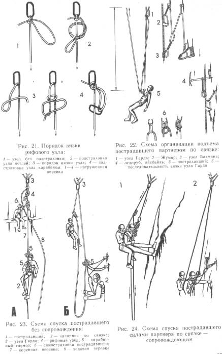 закрепляет спусковую веревку на карабине узлом (рис. 20) и снимает самостраховку пострадавшего;