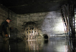 Коллектор заканчивается большой комнатой, на полметра затопленной водой. В углу комнаты стоит инсталляция из переплетенных между собой ржавых лестниц, символизирующая собой раздолбайство монтеров.