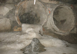 Пол уходит из-под ног. Впереди коллектор пересекает поперек большая железная труба. А под трубой- яма, неизвестной глубины и длины. Глубина ее явно больше, чем 1.5 метра. А дно покрыто засасывающим илом. Утонуть, конечно, не утонем, но грязи нахлебаемся точно.
