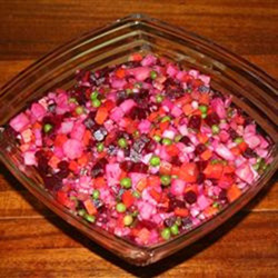 Картофель и морковь сварить на пару или припустить, нарезать кубиками или ломтиками, смешать с мелко рубленной капустой, очищенными и нарезанными кубиками огурцами и яблоками. Свеклу сварить в кожице, охладить, очистить, нарезать кубиками, заправить маслом, посолить и смешать с остальными продуктами.