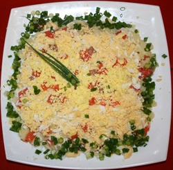 Свеклу, картофель и морковь отваривают, охлаждают и очищают от кожицы. - Картофель, свеклу, морковь и огурцы нарезают кубиками. - Яблоки и груши очищают от кожицы и сердцевины, нарезают кубиками и сбрызгивают лимонным соком. - Соединяют подготовленные продукты, добавляют отцеженный от жидкости горошек, соль, майонез, сахар, перемешивают. - Готовый салат оформляют дольками апельсина и посыпают измельченными и поджаренными орехами.