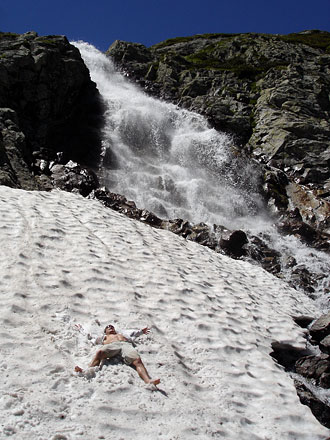 По снегу вниз группа может идти таким же способом, но энтузиазм здесь подстегивается только одним фактором: страхом. Те, кто посмелее, используют последнее достижение высокоснежных спусков — глиссер или старую добрую… задницу. Глиссером спускаться модно, но сложно. Метод заключается в том, что ты изображаешься лыжника без лыж. При этом не стоит забывать, что за спиной — тяжеленный рюк. Через минуту ножки начинают дрожать в коленках и тогда очень хочется плюнуть на всё и… На жопе катиться легко, но не так приятно. Во-первых, она очень быстро становиться мокрая, а во-вторых, скорость спуска не контролируется, и последний превращается в срыв.