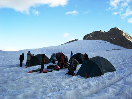 Утром проснулся от того, что на голову мне падает снег. Весь потолок палатки был покрыт замерзшим выхлопом четырех человек. Залез в мокрые ботинки, которые предусмотрительно поставил в палатку на ночь. (Те интеллигенты, что оставили обувь у порога, утром ходили в хрустальных туфельках как золушки). Снаружи палатка была покрыта кусками льда — ночью температура опустилась до -10. Самая страшная ночь похода закончилась…