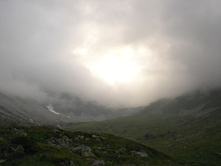 Пока все спали, чтобы хоть немного согреться, забрался на перевал, до которого мы чуть-чуть не дошли, и узрел один из самых красивых пейзажей похода. Внизу меж гор на высоте где-то 2500 метров висела пелена облаков, словно взбитая пенка молочного коктейля. Под ней лежала зеленая долина. Именно в этот момент я четко осознал, что стою на вершине. От этого осознания кружилась голова, и хотелось кричать во всё горло. Покричал. (А чего себя ограничивать?)