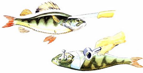 Мелкая рыба может очищаться в один заход. Сделайте надрез вокруг шеи, опустите нижнюю сторону рыбы на рабочую поверхность, схватите кусок отошедшей кожи клещами и сильно тяните кожу к хвосту. Этот метод особенно удобен при чистке угрей. Голову отрезают в последнюю очередь.