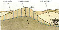 На близость грунтовых вод иногда указывает роение мошек и комаров, наблюдаемое после захода солнца, ярко-зеленые пятна растительности среди обширных пространств оголенного песка.