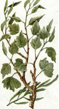 В поисках воды нередко помогают некоторые растения. В африканских пустынях таким растением - указателем подземного водоисточника - служит финиковая пальма. В пустынях Средней и Центральной Азии эту роль выполняет тополь разнолистный (Populus diversifolia). Это небольшое стройное деревцо - своеобразный живой насос, выкачивающий влагу из водоносного горизонта. Его светло-зеленые верхние листья широки и заужены <сердечком> к концам, как у настоящего тополя. Зато нижние длинные, узкие напоминают по форме ивовые (рис. 83).