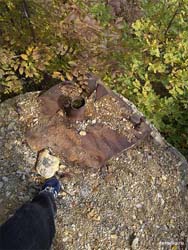 Еще через какое-то время я вышел на очередную поляну с остатками кострищ и стеклянных бутылок. Штолен не видно, но вот "туристы" облюбовали это место. Время уже поджимало, пора было возвращаться в основной квадрат поиска. Но мне не терпелось добить до конца эту тропку, и я поднялся еще выше. Между камнями журчал ручеек и метров через сто, уже еле заметная дорожка, полностью растворилась в каменных оползнях "курумниках". Единственный интересный объект, попавшийся на подъеме к основной вершине, оказался тросом, опутанным между деревьев. Рядом валялись искорёженные куски металла. При ближайшем рассмотрении это оказались дверки легковых автомобилей и один бампер. Кому понадобилось затаскивать на такую высоту эту хрень, да еще перевязывать все тросом? Или больные люди или что еще... Вообще было очень похоже на какое-то ритуальное место, только вместо черепов были куски машин...