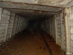 За дверьми сразу же начиналась осыпь, точнее последствия недавнего обвала. Потолок штольни здесь не был укреплен и возможно из-за близости выхода, влияющего на микроклимат в подземелье, случилось обрушение свода. Передвигаясь буквально на носочках, чтобы не вызвать повторного обвала, я добрался до коридора с укрепленным потолком. На право пошел штрек с низким потолком. Пройдя метров десять, я отчетливо услышал позади себя чьи-то шаги. Испуганно обернувшись, естественно никого не увидел. Пройдя дальше, опять услышал шаги... И на этот раз позади никого не было. Я понял, что это эхо отражается от каменных стен штольни, но все равно, зная это, и при дальнейшем передвижении было немного не по себе от этого эффекта. Штрек закончился бетонной перегородкой. Ее, наверное, поставили, когда этот участок был выработан, чтобы люди просто так туда не ходили, не провоцировали обвалы. В стене было небольшое отверстие, проломленное уже в наше время. В него вполне можно было пролезть. Заглянув внутрь, я увидел продолжение хода, только он находился в очень плохом состоянии, повсюду были видны следы обвалов, потолок нигде не был укреплен. Я не стал рисковать и залазить в эту дырку, тем более как оказалось, таких ответвлений здесь полным полно. Времени было немного, и, я потратил его на изучение основной штольни.