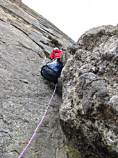 Значит дождь вам девочки не нравится, ну что же значит будет град. Такого альпинизма у меня еще не было! Процесс выглядел примерно так: разгреб от снега дрожащими ручками щель, быстро быстро пока ее не засыпало снова вставил (простите за выражение) какой то закладной элемент и загреб обратно (ну для надежности), то же и с полочками под скайхук и с рельефом под лазанье. Но так как на дворе все же лето и температура не смотря ни на что плюсовая, все что падает с неба, стремительно тает и летит! Голову поднять невозможно. По каске все время тарабанят то мелкие камни, то лед, то вода. Что я здесь делаю!